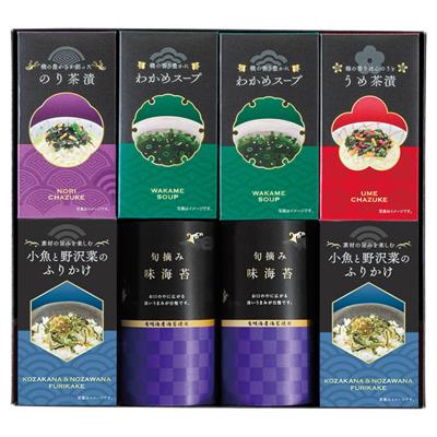 味海苔(8切16枚)・小魚と野沢菜のふりかけ(6袋入)・わかめスープ(6袋入)各2、のり茶漬(6袋入)・うめ茶漬(6袋入)各1