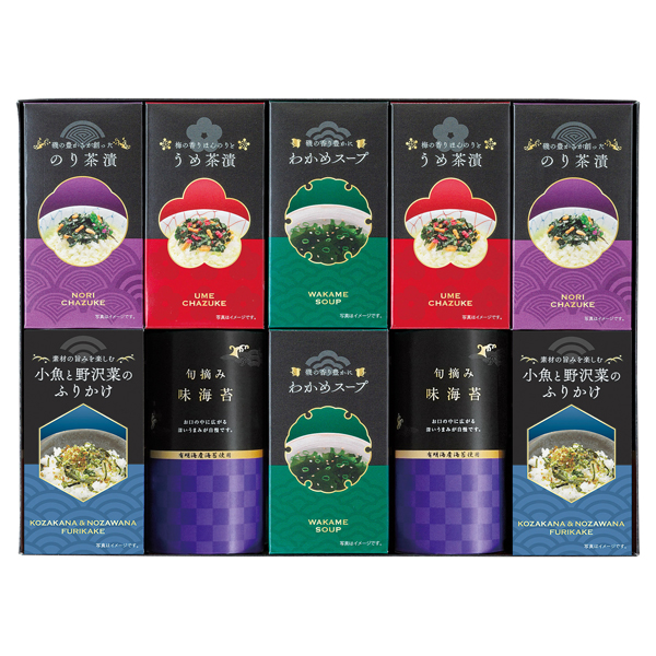 味海苔(8切16枚)・小魚と野沢菜のふりかけ(6袋入)・のり茶漬(6袋入)・うめ茶漬(6袋入)・わかめスープ(6袋入)各2