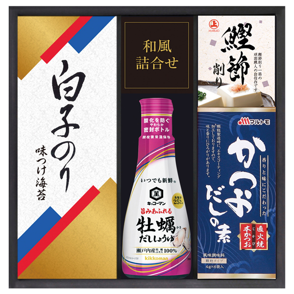 マルトモかつおだしの素(6袋入)・鰹節削り(2袋入)・白子のり味のり(3切5枚)・キッコーマン牡蠣だししょうゆ200mL各1