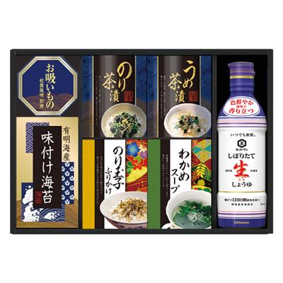 キッコーマンしぼりたて生(なま)しょうゆ450mL・永谷園お吸いもの松茸風味(2袋入)・有明海産味付海苔(8切8枚)・のり茶漬け(2袋入)・うめ茶漬け(2袋入)・のり玉子ふりかけ(2袋入)・わかめスープ(2袋入)各1
