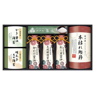 かき醤油海苔(8切6枚)・明太子風味海苔(8切6枚)・卵かけ醤油200mL・刺し身醤油200mL・天然醸造醤油200mL・瀬戸内藻塩50g・本枯れ鰹節(3袋入)各1
