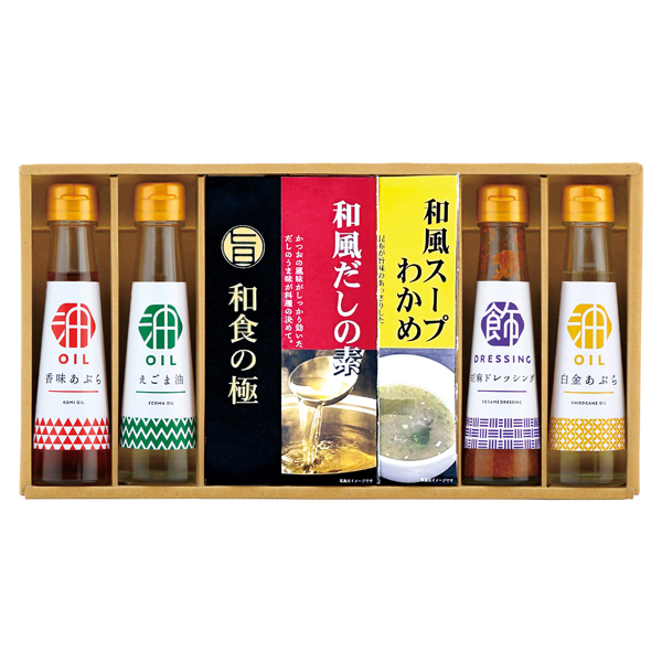 香味あぶら90g・えごま油90g・白金あぶら90g・胡麻ドレッシング100mL・和風だしの素(3袋入)・わかめスープ(2袋入)各1