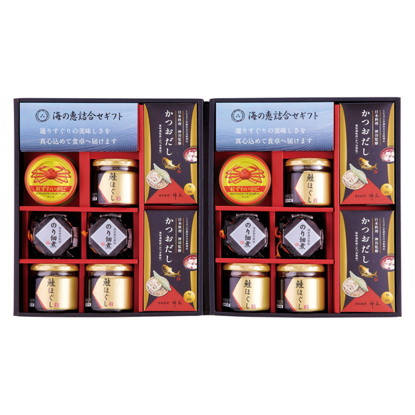 鮭ほぐし50g×6、のり佃煮80g・かつおだし(8袋入)各4、紅ずわいがにほぐし身55g×2