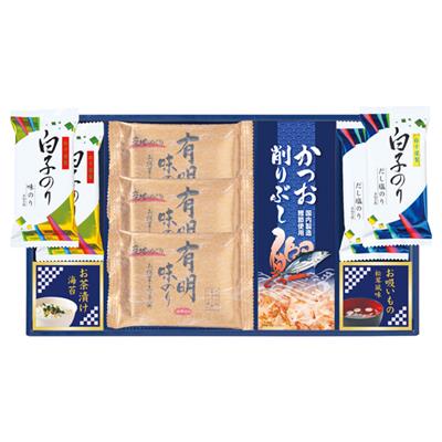 白子のり有明味のり(8切8枚)×3、白子のり味のり(8切5枚)・白子のりだし塩のり(8切5枚)各2、永谷園お茶づけ海苔(2袋入)・永谷園お吸いもの松茸風味(2袋入)・かつお削りぶし(4袋入)各1