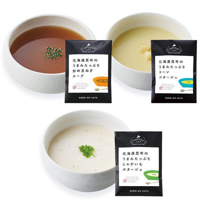 北海道昆布うまみたっぷり(たまねぎスープ×2・じゃがいもポタージュ・コーンポタージュ)・ふりかけ(かに海苔・うに海苔)2g×各2 【卵・乳成分・小麦・えび・かに】