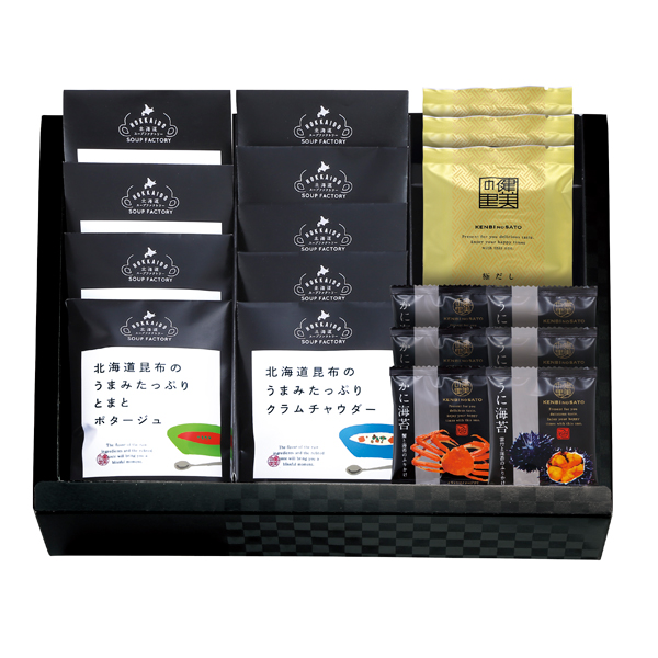 北海道昆布うまみたっぷり(たまねぎスープ×3・じゃがいもポタージュ・コーンポタージュ・とまとポタージュ・クラムチャウダー・えびビスク・かにビスク)・極だし6g×3・ふりかけ(かに海苔・うに海苔)2g×各3 【卵・乳成分・小麦・えび・かに】