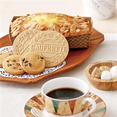 アーモンドパウンドケーキ・チョコチップクッキー各1、ドリップコーヒー7g・ゴーフレット(チョコ)各2