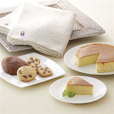 ■セット内容: | チーズケーキ直径約14cm・ソフトチョコケーキ・チョコチップクッキー・チェスクッキー・フェイスタオル(約34×75cm)各2、ウォッシュタオル(約34×35cm)×4・タオル/日本製 |