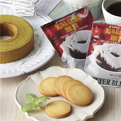 ドリップ珈琲8g×3、コーヒークッキー×8、ミニバウムクーヘン(北海道生クリーム)×3