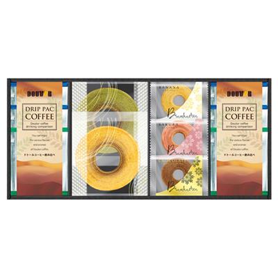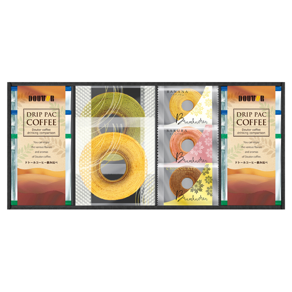 ドトールドリップコーヒー(深煎りブレンド)7g×4、ドトールドリップコーヒー(キリマンジャロブレンド)7g×2、バウムクーヘン(ミルク直径約10.5cm・宇治抹茶直径10.5cm各1)、ミニバウムクーヘン(バナナ・ベルギーショコラ・桜各1)