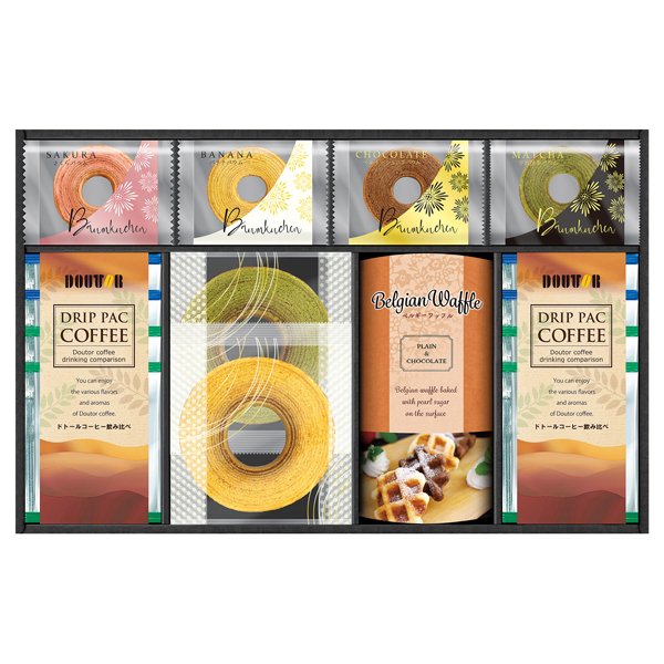ドトールドリップコーヒー(深煎りブレンド)7g×4、ドトールドリップコーヒー(キリマンジャロブレンド)7g×4、バウムクーヘン(ミルク直径約10.5cm・宇治抹茶直径約10.5cm各1)、ミニバウムクーヘン(バナナ・ベルギーショコラ・桜・宇治抹茶各1)、ベルギーワッフル(プレーン×2、ショコラ×1)