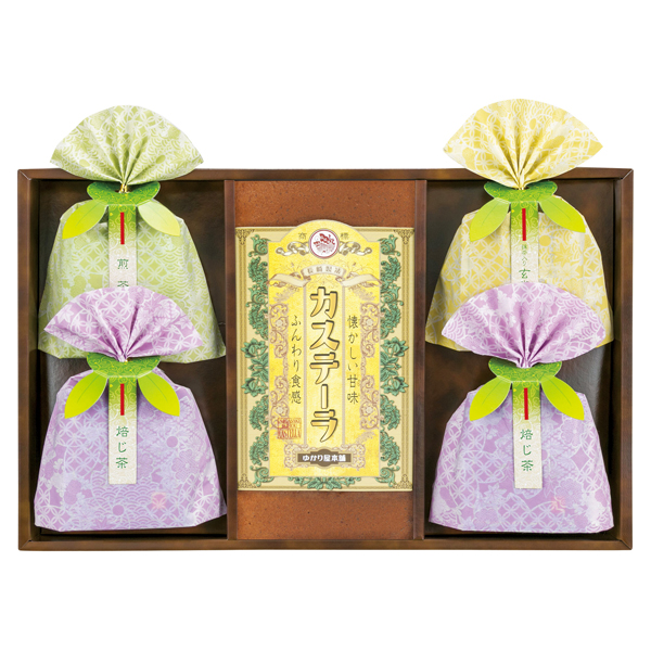 カステーラ(7切入)×1、ティーバッグ(ほうじ茶2袋×2、抹茶入玄米茶2袋・煎茶2袋各1)