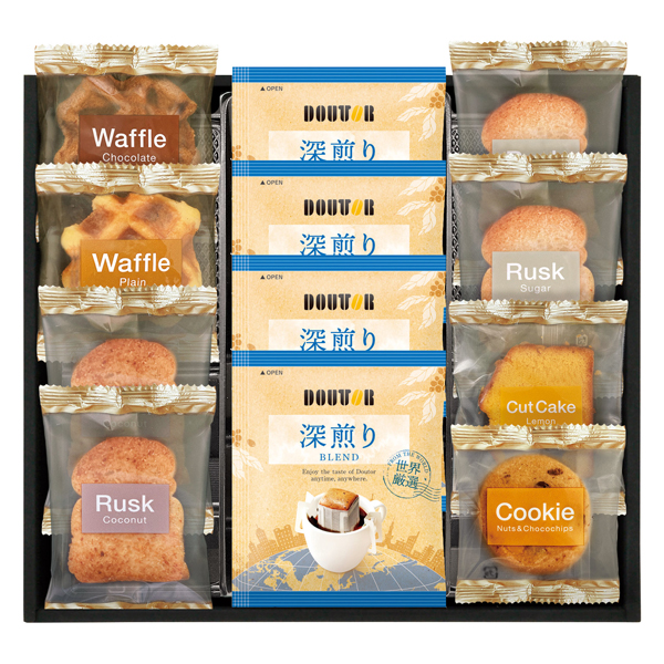 ドトールドリップコーヒー7g×4、ラスク(シュガー・ココナッツ各2)、ワッフル(プレーン・チョコ各1)、ナッツとチョコのざっくりクッキー・レモンケーキ各1