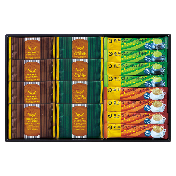 宇治抹茶オーレ10g・焙じ茶オーレ10g各4、ゴーフレット(チョコクリーム・抹茶クリーム各4)