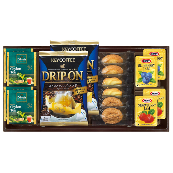 キーコーヒードリップオン8g×2・プチクッキー(リング・ペカン・カシュー)各2・ディルマ セイロンティー2g×4・ジャム(ストロベリー・ブルーベリー)14g×各2 【卵・乳成分・小麦】