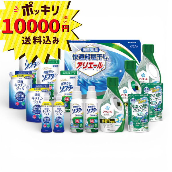 生乾き臭・カビ臭にWで効く部屋干し用のアリエールジェルと本格消臭の抗菌部屋干しソフター、食器洗剤除菌キッチンジェルが入ったクリーンギフトです。