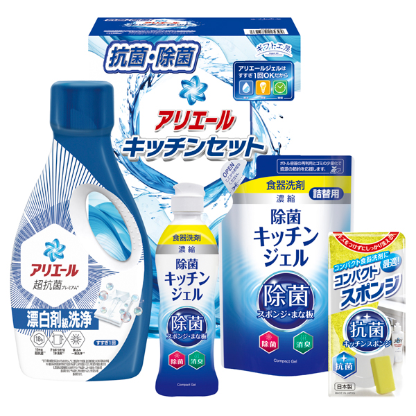 抗菌力・洗浄力・消臭力に優れたアリエールにキッチンまわりの除菌・抗菌アイテムを加えたアリエールキッチンセットです。