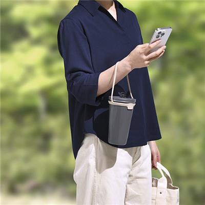 ストロー付きで飲みやすく、持ち運びしやすいストラップが付いたタンブラー。