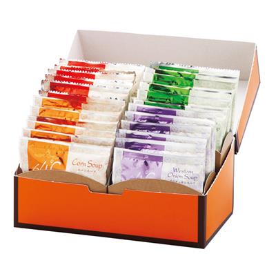 スープを温かくおいしく感じられ、体温上昇にもつながる温度が64度と言われています。シーンに合わせて味わい選べる、4種類。化粧箱を開ければ、小分けして置ける小箱タイプになっています。キッチンやテーブルに置いておけるのでとっても便利です。